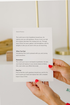 The cards are meant to live where life happens—on a nightstand, counter, desk, or inside a scripture cover. Let them meet you where you are.